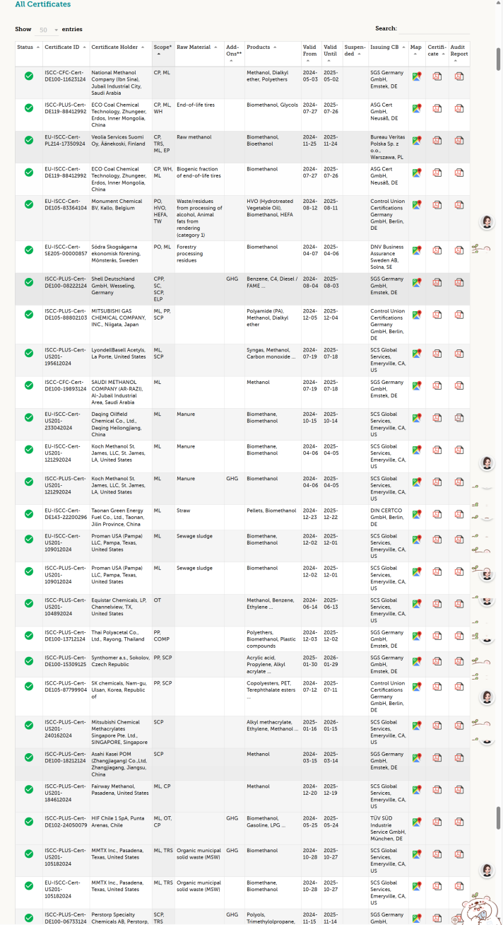 势银(TrendBank)通过ISCC官网了解到,目前全球仍在有效期内的ISCC证书有13399张,其中认证产品涉及甲醇的ISCC证书仅37张,发证认证机构有SGS、ASG、BV、SCS、TÜV SÜD、DNV、Control Union Certifications Germany GmbH、TÜV NORD、DIN CERTCO等。