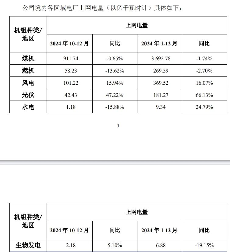 2024年1-12月,国投电力水电发电量1,040.85 亿千瓦时,同比增长10.49%;火电发电量564.14亿千瓦时,同比减少2.94%;风电发电量65.33亿千瓦时,同比增长0.60%;光伏发电量48.21亿千瓦时,同比增长63.27%。