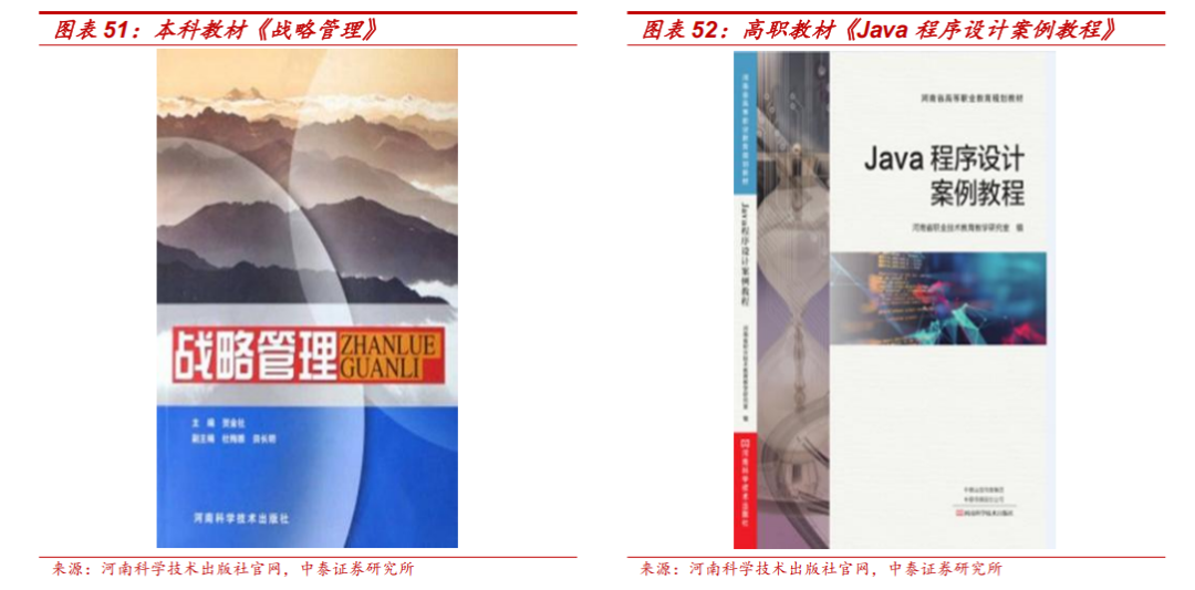 完善教材体系,拓展本科与职业教育市场。公司积极完善教材体系,在深耕K12 教育领域的基础上,旗下河南科学技术出版社不断拓展高等教育与职业教育市场,聚焦本科及职业教材精品出版,突出高等教育与职业教育特色。在“十四五”首批职业教育河南省规划教材中,河南科学技术出版社 93 种教材入选,覆盖公共课、医护、财经等多个领域,入选种类位居首位。