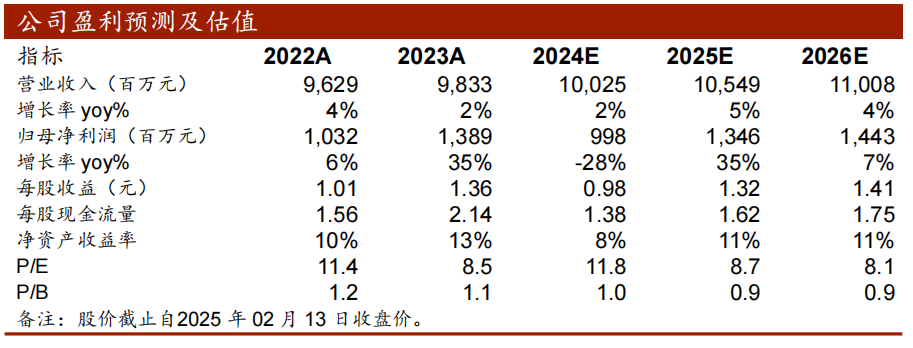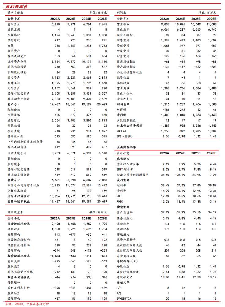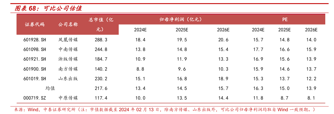 我们预计中原传媒2024-2026年收入分别为100.25/105.49/110.08亿元,分别同增1.95%/5.22%/4.35%。考虑到所得税政策变化会对公司2024-2026年归母净利润产生影响(其中,2024年归母净利润涉及冲回2023年度确认的相关递延所得税资产,所得税免征对于2025-2026年归母净利润构成正向影响),我们预计2024-2026年归母净利润分别为9.98/13.46/14.43亿元,分别同比增长-28.14%/+34.90%/+7.22%,对应PE估值分别为11.8x/8.7x/8.1x。我们选择出版行业内同样从事图书出版发行公司作为可比对象,包括凤凰传媒、中南传媒、浙版传媒(维权)、南方传媒(维权)、山东出版。参考同业可比公司,考虑到公司教材教辅稳健增长,且积极利用内容、渠道优势拓展教育服务生态,有望打开业绩成长空间,且估值低于可比公司平均水平,建议持续关注,首次覆盖,给予“买入”评级。