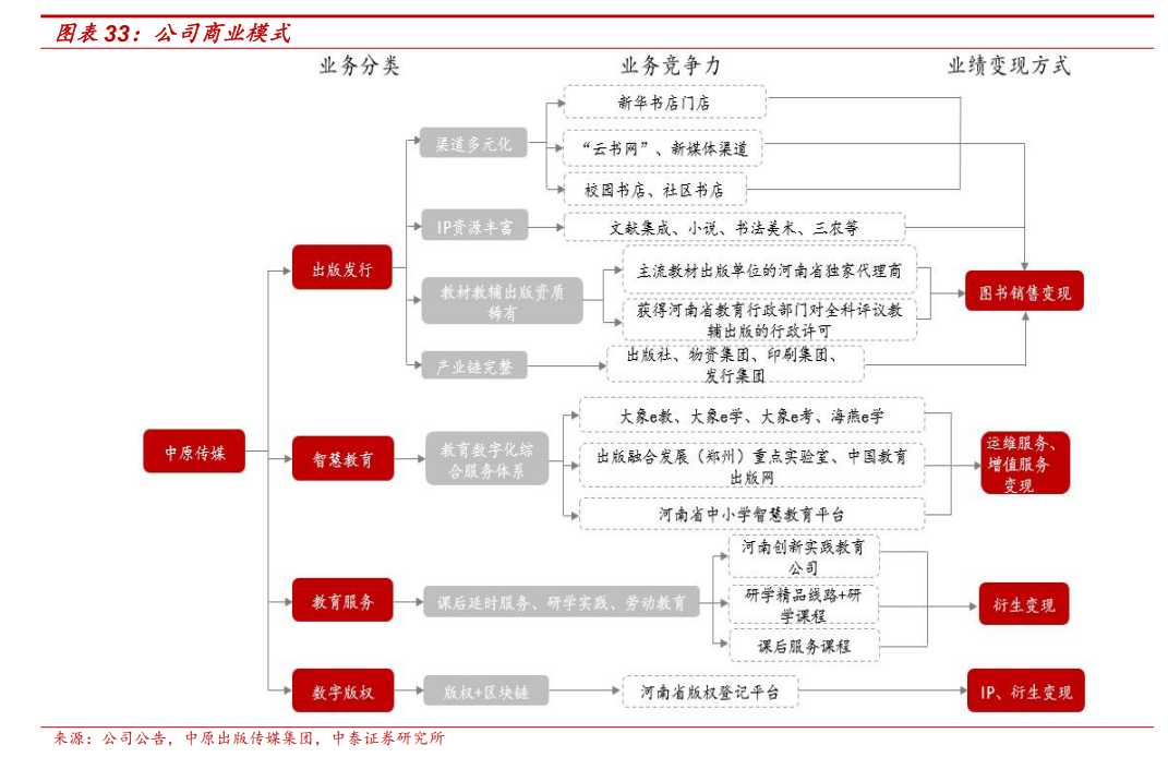 首先,公司以教材教辅、一般图书的出版发行为主要业务,旗下出版社、物资集团等子公司提供出版完整产业链服务,积累了丰富的 IP 资源(文献集成、小说等类型)。公司是主流教材出版单位的河南省独家代理商,所属出版企业获得了河南省教育行政部门对全科评议教辅出版的行政许可,资质优势明显,开发出版了系列教辅产品。同时,公司积极开拓多元化渠道,包括传统新华书店门店、云书网、新媒体渠道等,助力图书销售转化。