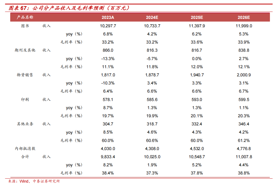 我们对公司不同业务进行拆分,公司未来收入主要由图书、期刊及其他、物资销售、印刷等部分构成。