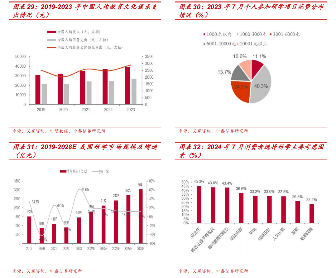 另外,艾媒咨询数据指出,2023 年我国研学市场规模达 1,469 亿元,随着研学文旅观念持续普及,研学市场景气度有望持续向上,预计 2028 年市场规模将达 3,041 亿元,5 年 CAGR 达 15.7%,市场发展空间广阔。消费者在选择研学项目时更注重相关安全保障及内容深度,拥有专业资质集成、渠道优势、国有属性背书的出版公司有望脱颖而出。