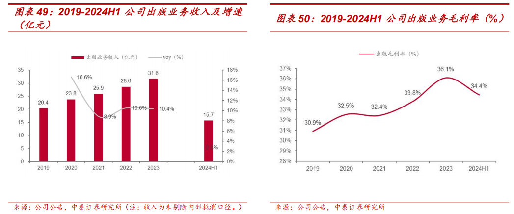 主业稳步推动收入稳中向上。2019-2023 年,公司因时而进,在推进创新业务探索的同时,聚焦主业,虽然 2021 年收入受疫情等因素影响有所承压,但整体营收仍然稳定,从 95.0 亿元增长至 98.3 亿元,4 年 CAGR 达 0.9%。其中,主业出版及发行业务(未剔除内部抵消口径)4 年 CAGR 分别达 11.6%及 3.3%,稳步推动公司收入向上。