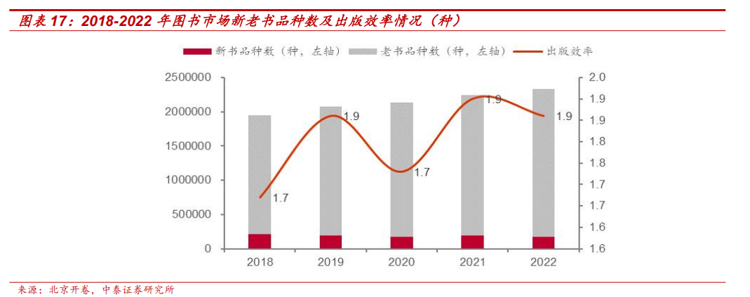 新书出版效率提升,利于打造内容良性发展业态。通过追踪读者阅读变化趋势,及时出版读者关注热点的图书能够有效触达读者,并基于此第一时间获取销售反馈进行优化,因此新书的出版效率提升明显。北京开卷数据显示,2022 年新书出版效率已达 1.9,反映出新书的单品种获益能力提升,能有效激发图书创作者的创作动力,促进新选题策划,从而持续产出高质量书籍,利于打造良性发展业态。