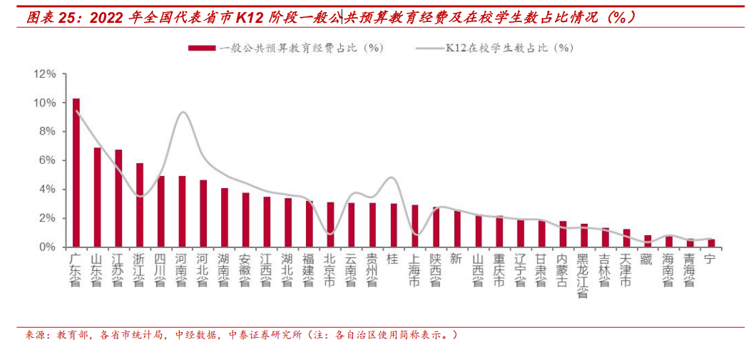 我国教育公平化需求亟待满足,智慧教育落地重要性愈发凸显。我国作为教育大国,虽然发展教育公平化已取得丰硕成果,但是仍面临诸多挑战。区域间的经济发展、社会文化、师资储备、教育成本差异,造成不同区域间教育资源及教育发展水平的不平衡,部分地区教育经费占比低于学生占比的现象仍然显著,例如河南省 2022 年 K12 在校学生数占全国代表省市学生数比重达 9.3%,教育经费占比仅 4.9%。