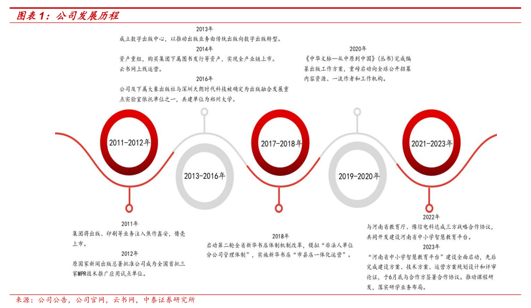 2011 年,公司借壳焦作鑫安上市。2013 年,公司成立数字出版中心,加快数字转型节奏。2014 年,公司完成资产重组,实现全产业链上市。2018 年,公司启动二轮新华书店体制改革,激发内生活力。2022-2023 年,公司聚焦智慧教育、课程研发、研学实践赛道,全面启动以服务现代教育为核心的智慧教育平台、课后延时服务智慧云平台和研学实践智慧平台建设。