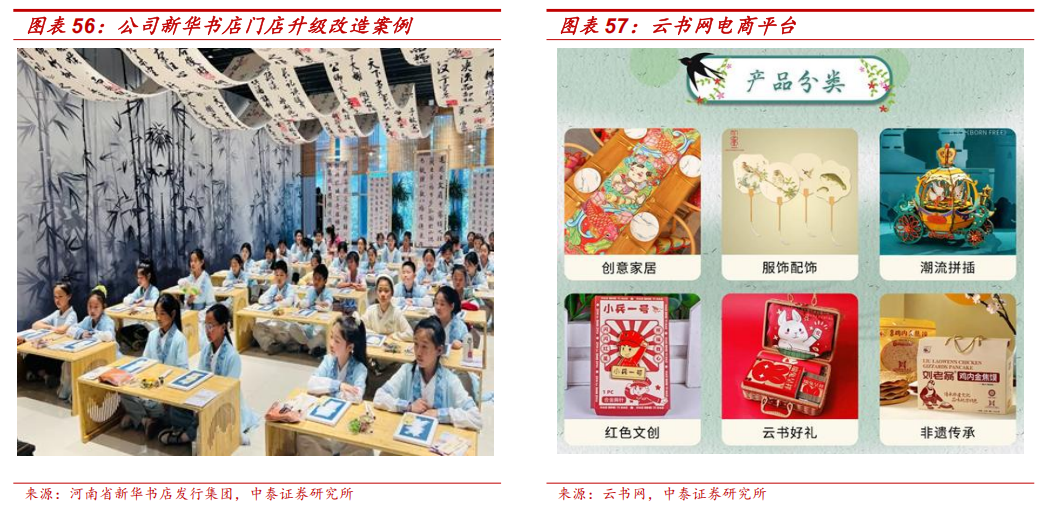 门店升级提升坪效,云书网经营向好。具体而言,线下渠道方面,公司自 2021年 9 月起,启动全省门店升级改造工作,通过主题化、特色化、智能化的焕新再造,成功打造了适用于省、市、县三级门店的标杆示范。截至 2024 年11 月,全省累计升级改造实体门店总面积超 50,000 平方米,加快“传统卖场”向“复合 IP”的转变进程,助力经营坪效与品牌效益提升。