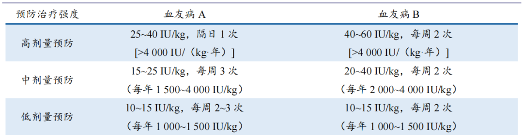 从另一个视角看,血友病更像是一种慢性病,为了防止出血而定期给予规律性的替代治疗被认为是血友病治疗的最优方案。国际上主流给药方案是中剂量(每剂 15-30IU/kg,A型血友病患者每周给药 3 次,B型血友病患者每周 2次)和大剂量(每剂 25-40IU/kg,A型血友病患者隔日1次,B型血友病患者每周 2次),而我国目前采用的仍是低剂量方案,(A型血友病患者10 IU/kg,每周2~ 3次;B型血友病患者20 IU/kg,每周1次)。
