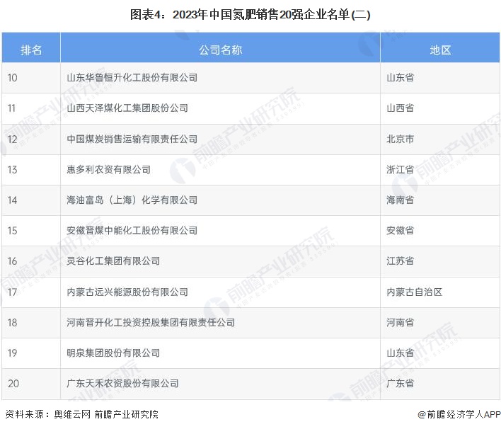 2024年中国氮肥工业协会发布《2023年全国氮肥企业尿素产量20强》名单,2023年中国氮肥销售20强企业具体如下: