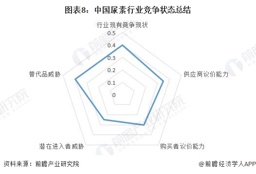 根据以上分析,对各方面的竞争情况进行量化,0.5代表最大,0代表最小,目前我国尿素行业五力竞争总结如下: