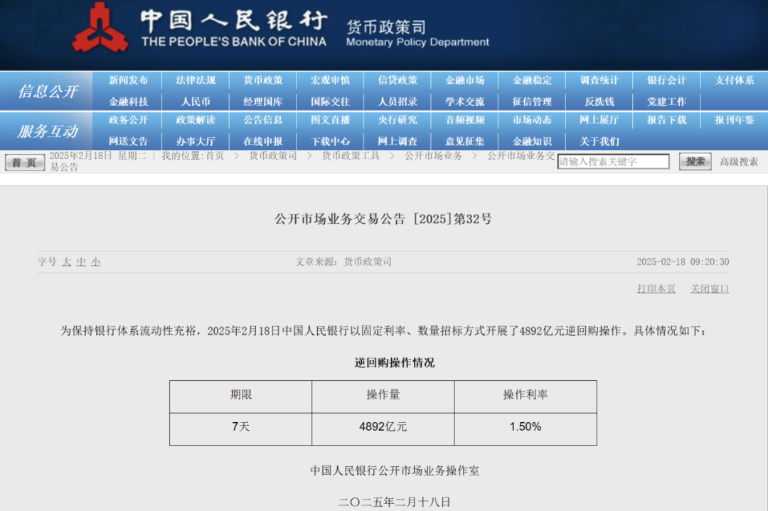 首先来看央行动作:为保持银行体系流动性充裕,2月18日,中国人民银行开展4892亿元逆回购操作,操作利率为1.5%。数据显示,当日有330亿元逆回购和5000亿元MLF到期。