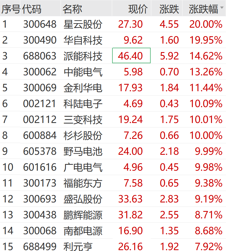 个股方面,星云股份、华自科技20CM涨停,科陆电子、三变科技、杉杉股份、野马电池等多股集体封住涨停板,派能科技、金利华电等涨超10%。