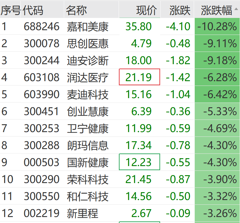 另外,前期火热的智慧医疗概念,上午集体回调。嘉和美康跌超10%,迪安诊断、思创医惠、润达医疗、麦迪科技等多股大跌。