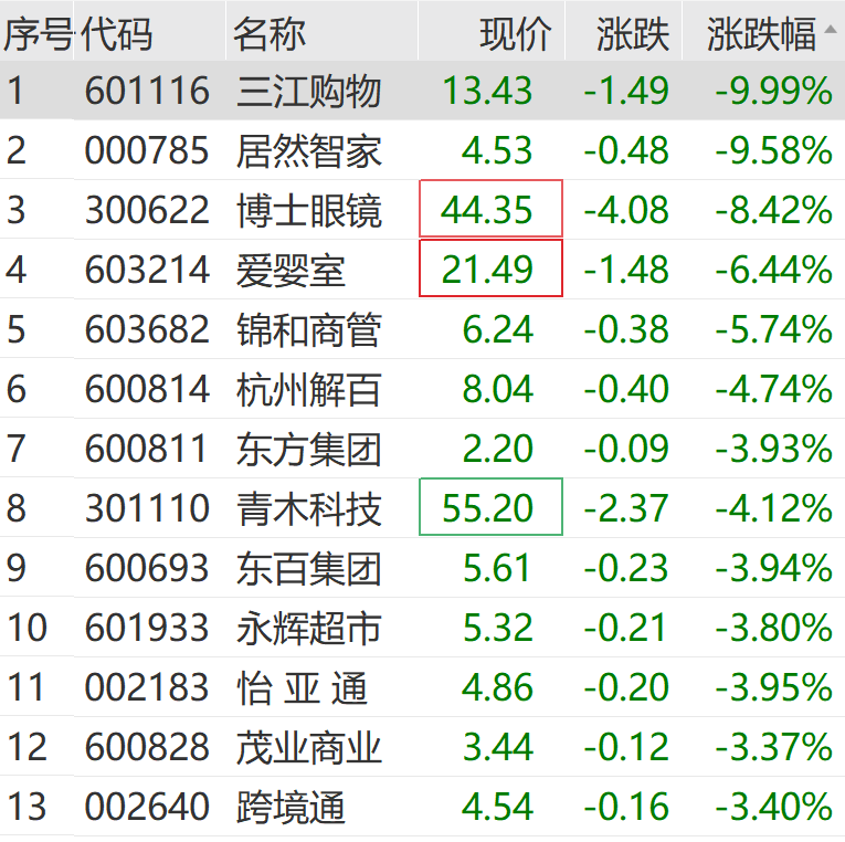 2月18日上午,商贸零售板块表现不振。三江购物开盘跌停,居然智家盘中触及跌停,博士眼镜、锦和商管、爱婴室、杭州解百等多股接连走低。