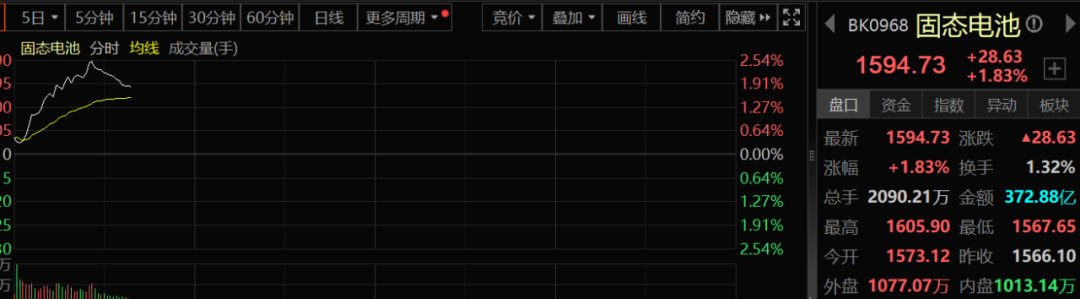 今天早盘,很多前期的热门股开始退潮,但固态电池爆发。星云股份、杉杉股份、传艺科技、山东章鼓、龙蟠科技等多股一度涨停。固态电池指数一度大涨超2%,远远要好于大市的表现。