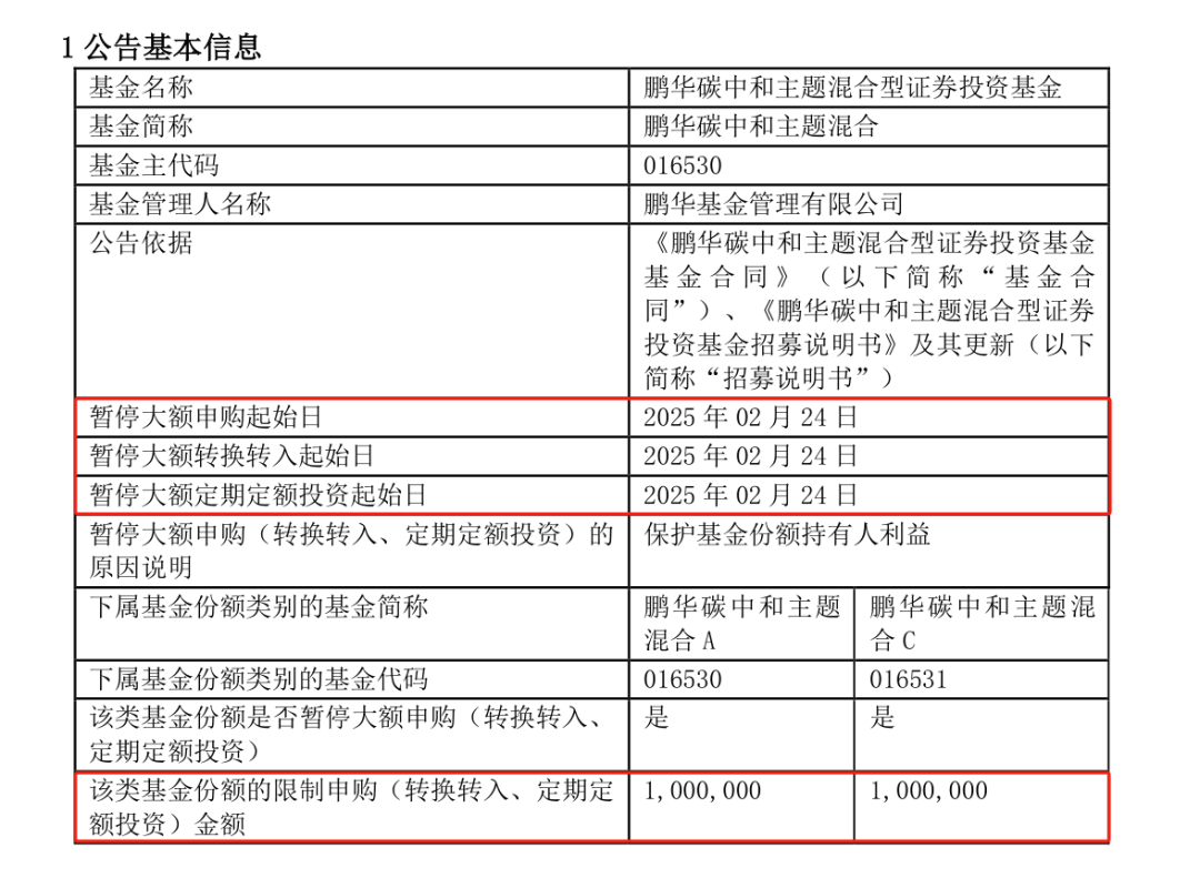 2月21日,鹏华基金公告称,自2月24日起,将鹏华碳中和主题基金的个人投资者单日单个基金账户累计的申购、转换转入、定期定额投资金额限额设置为100万元。