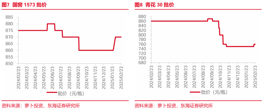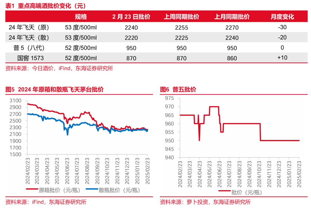 白酒:近期酒企密集停货,控量控价积极。泸州老窖:泸州大成浓香酒类销售有限公司发布通知,2月19日起暂停接收泸州老窖老头曲500ml装产品订单与发货,恢复时间另行通知。2月21日,泸州老窖怀旧酒类营销有限公司发布通知,表示即日起暂停接收泸州老窖特曲60版系列产品订单与发货,恢复时间另行通知。山西汾酒:根据微酒,2月17日汾酒青花20、老白汾酒10两款产品已在多地停止供货,未来将全部升级为五码合一的新版产品。节后多家酒企发布停货通知,积极控货挺价,调节供需矛盾。2025年酒企更加注重自身的发展质量、量价平衡以及各渠道的健康发展。批价更新:上周飞天茅台批价保持小幅下跌。截至2月23日,2024年茅台散飞批价2220元,周环比下降5元,月环比下降20元;2024年茅台原箱批价2240元,周环比下降15元、月环比下降30元。五粮液普五批价为950元,周、月环比持平。国窖1573批价870元,批价周环比持平、月环比上涨10元。板块基本面已筑底,期待后续政策持续加码带动白酒需求修复。白酒行业竞争加剧,头部酒企的市场份额不断提升且经营业绩稳健,建议关注高端酒和区域龙头。