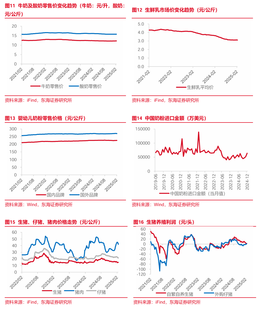 乳制品价格:截至2025年2月14日,牛奶零售价12.21元/升,周环比+0.08%,同比-1.21%;酸奶零售价15.78元/公斤,周环比+0.06%,同比-2.29%;生鲜乳3.11元/公斤,同比-14.10%;国内品牌婴幼儿奶粉零售价225.30元/公斤,国外品牌270.22元/公斤。另外,12月中国奶粉进口金额为63944.20万美元。