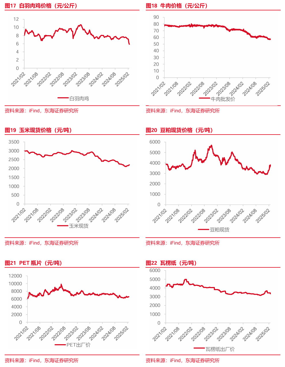 包材价格:截至2025年2月21日,PET瓶片6600/吨,周环比+0.76%,同比-10.20%;瓦楞纸3340元/吨,周环比-2.91%,同比-2.91%。
