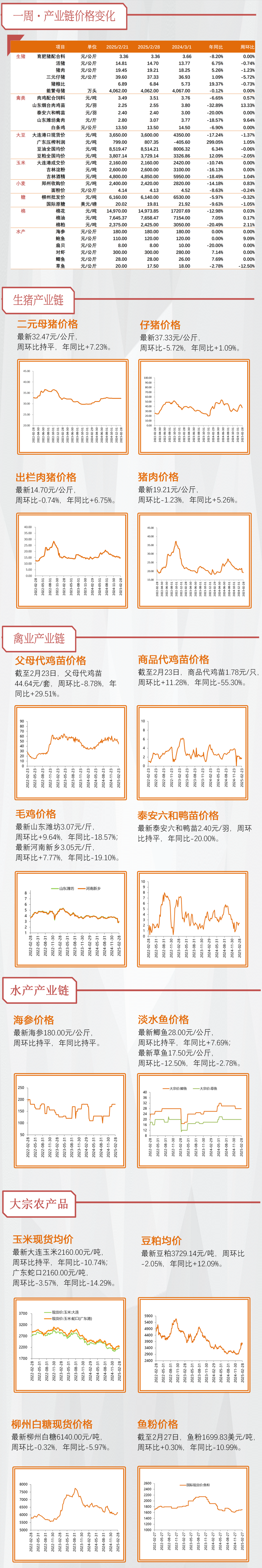 1)重点推荐【海大集团】。水产养殖/水产料历经2+年低谷,养殖饲料产能明显去化,今年水产料景气有望改善。本周草鱼/罗非/生鱼/加州鲈/黄颡/南美白对虾塘口均价环比+2.3%/ -2.4%/ -4.8%/ +1.4%/ +5.6%/ +4.4%;同比+13%/ -19%/ -5%/ +32%/ +15%/ +8%,本周大部分水产品价格持续向好,仅罗非鱼、生鱼价格下跌。其中草鱼、鲤鱼、黄颡鱼、南美白对虾价格因存塘持续减少,市场需求相对稳定,价格较上周呈现明显上涨趋势。原材料大幅波动下海大强化市场主动攻击策略,海大市占率加速提升。消费提振背景下,叠加24年投苗情况,预计25年多品种水产景气向上,量价利弹性凸显。重视公司基本面拐点+估值性价比。