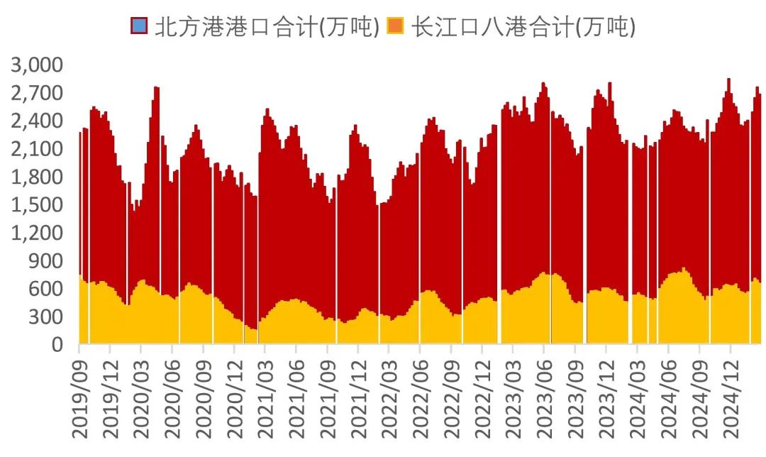 备注:北方港统计口径包括秦皇岛港、国投曹妃甸港、曹二期、华能曹妃甸、华电曹妃甸、国投京唐、京唐老港、京唐36-40码头、黄骅港、天津港、锦州港、丹东港、盘锦港、营口港、大连港、青岛港、龙口港、嘉祥港、岚山港、日照港。长江口八港统计口径包括如皋港、长宏国际、江阴港、扬子江、太和港、镇江东港、南京西坝、华能太仓