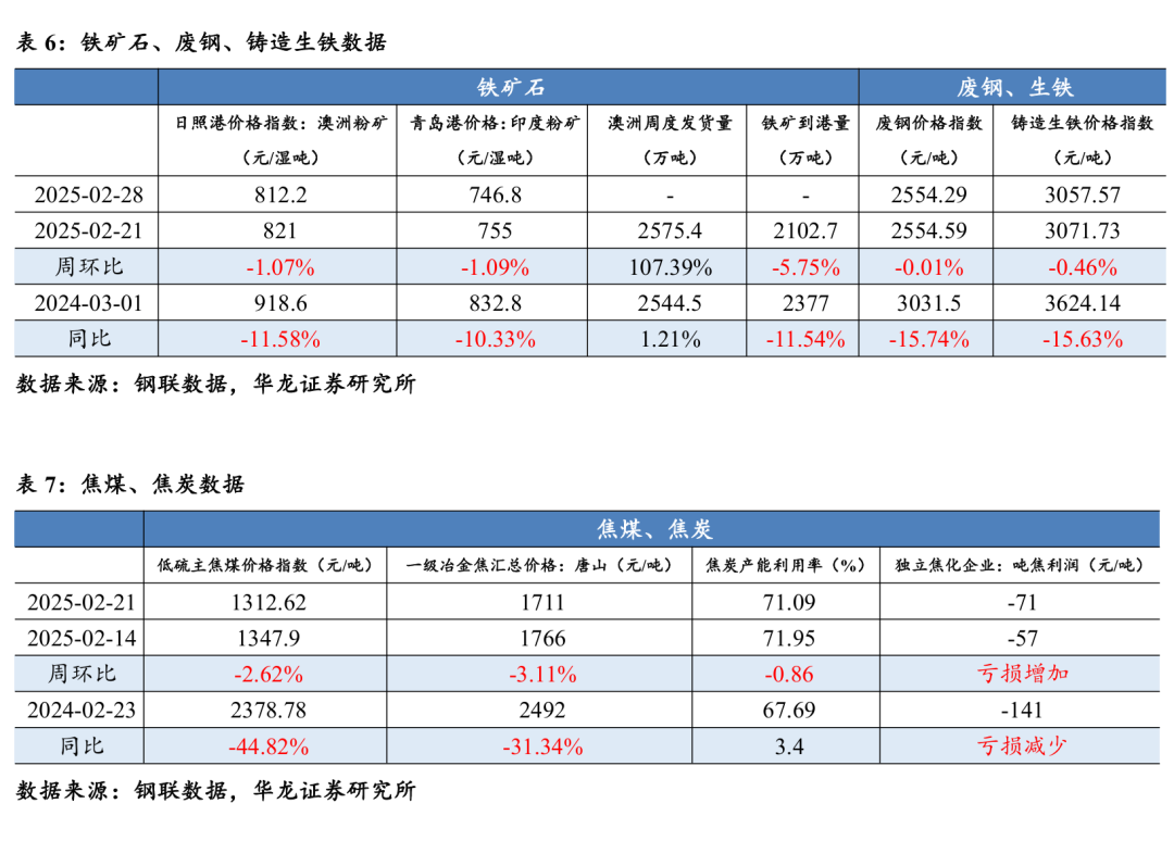 成本端:铁矿石:截至2025年2月28日,澳洲粉矿日照港62%Fe价格指数812.2元/湿吨,周环比下降1.07%,同比下降11.58%;印度粉矿青岛港61%Fe价格746.8元/湿吨,周环比下降1.09%,同比下降10.33%;截至2025年2月21日,19个港口澳洲&巴西铁矿石发货量2575.4万吨,周环比上升107.39%,同比上升1.21%;45个港口铁矿到港量2102.7万吨,周环比下降5.75%,同比下降11.54%。废钢&铸造生铁:截至2025年2月28日,废钢综合绝对价格指数2554.29元/吨,周环比下降0.01%,同比下降15.74%;铸造生铁综合绝对价格指数3057.57元/吨,周环比下降0.46%,同比下降15.63%。焦煤&焦炭:截至2025年2月28日,低硫主焦煤价格指数1312.62元/吨,周环比下降2.62%,同比下降44.82%;唐山一级冶金焦汇总价格1711元/吨,周环比下降3.11%,同比下降31.34%;230家独立焦化厂产能利用率71.09%,周环比下降0.86 pct,同比上升3.40 pct;独立焦化企业:吨焦利润-71元/吨,周环比亏损增加。