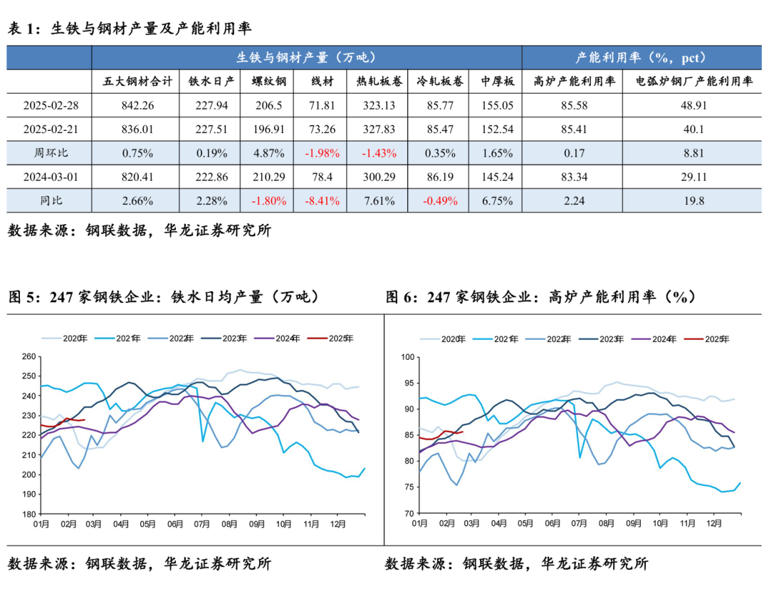 截至2025年2月28日,五大钢材合计产量842.26万吨,周环比上升0.75%,同比上升2.66%;247家钢铁企业铁水日均产量227.94万吨,周环比上升0.19%,同比上升2.28%;247家钢铁企业高炉产能利用率85.58%,周环比上升0.17 pct,同比上升2.24 pct;87家独立电弧炉钢厂产能利用率48.91%,周环比上升8.81 pct,同比上升19.80 pct。