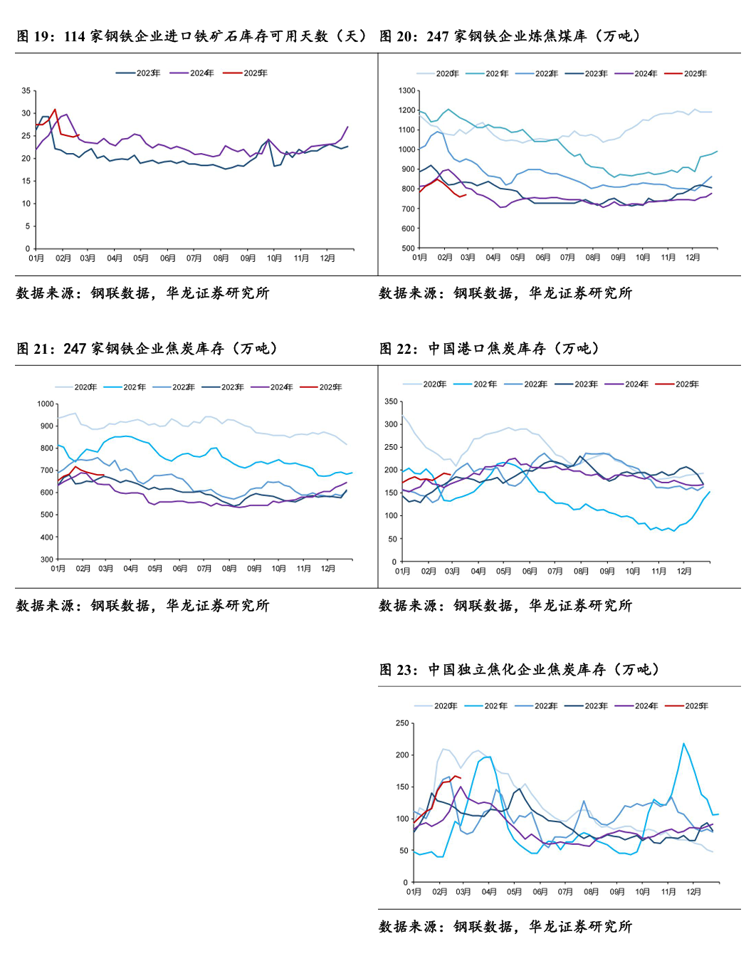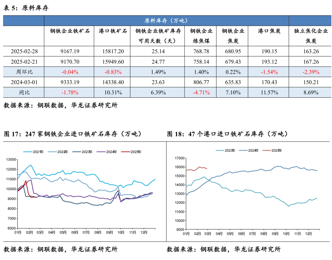 截至2025年2月28日,247家钢铁企业进口铁矿石库存9167.19万吨,周环比下降0.04%,同比下降1.78%;47个港口进口铁矿石库存15817.20万吨,周环比下降0.83%,同比上升10.31%;114家钢铁企业进口铁矿石库存可用天数25.14天,周环比上升1.49%,同比上升6.39%;247家钢铁企业炼焦煤库768.78万吨,周环比上升1.40%,同比下降4.71%;247家钢铁企业焦炭库存680.95万吨,周环比上升0.22%,同比上升7.10%;中国港口焦炭库存190.15万吨,周环比下降1.54%,同比上升11.57%;中国独立焦化企业焦炭库存163.26万吨,周环比下降2.39%,同比上升8.69%。
