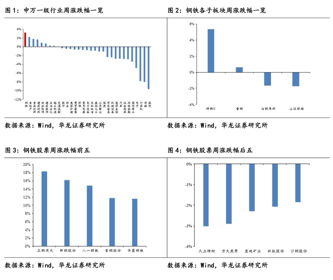 在重点覆盖公司中,个股涨跌幅前五的公司为三钢闽光(18.26%)、新钢股份(16.14%)、八一钢铁(14.85%)、首钢股份(11.76%)、华菱钢铁(11.64%);个股涨跌幅后五的公司为久立特材(-3.02%)、方大炭素(-2.90%)、宝地矿业(-2.28%)、钒钛股份(-2.06%)、沙钢股份(-1.85%)。