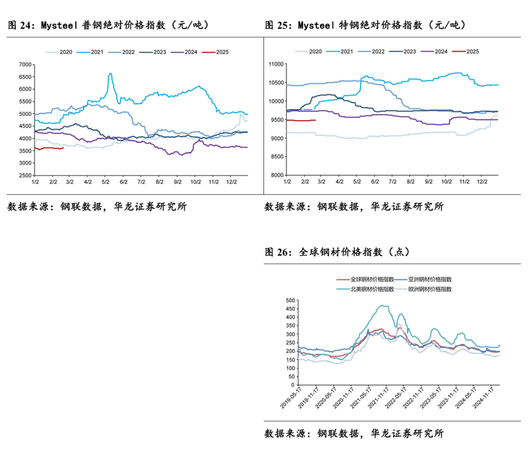 截至2025年2月28日,Mysteel普钢绝对价格指数3591.26元/吨,周环比-0.94%,月环比-0.57%,同比-14.03%;Mysteel特钢绝对价格指数9486.08元/吨,周环比持平,月环比+0.02%,同比-2.55%;2025年2月21日,全球钢材价格指数200.7点,周环比持平,月环比+3.03%,同比-13.27%。