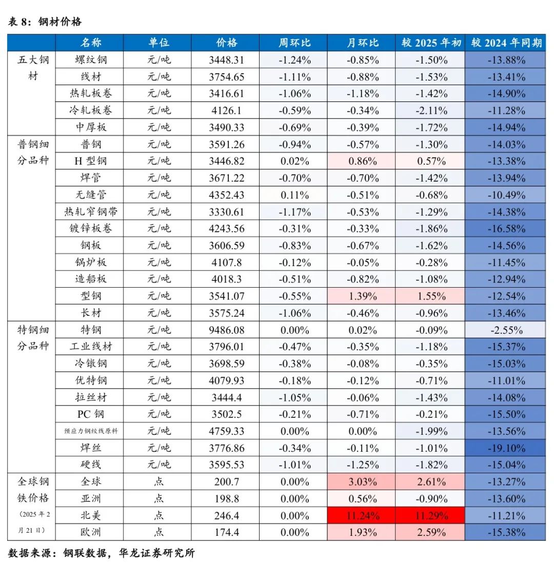 价格端:截至2025年2月28日,Mysteel普钢绝对价格指数3591.26元/吨,周环比-0.94%,月环比-0.57%,同比-14.03%;Mysteel特钢绝对价格指数9486.08元/吨,周环比持平,月环比+0.02%,同比-2.55%;2025年2月21日,全球钢材价格指数200.7点,周环比持平,月环比+3.03%,同比-13.27%。钢材下游终端钢材采购需求逐步释放,但海外关税对钢材价格仍存扰动,预计钢材价格短期震荡。