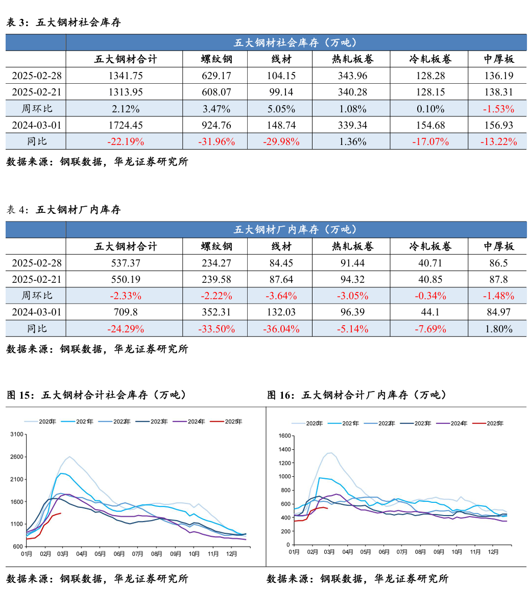 截至2025年2月28日,五大钢材合计社会库存1341.75万吨,周环比上升2.12%,同比下降22.19%;五大钢材合计厂内库存537.37万吨,周环比下降2.33%,同比下降24.29%。