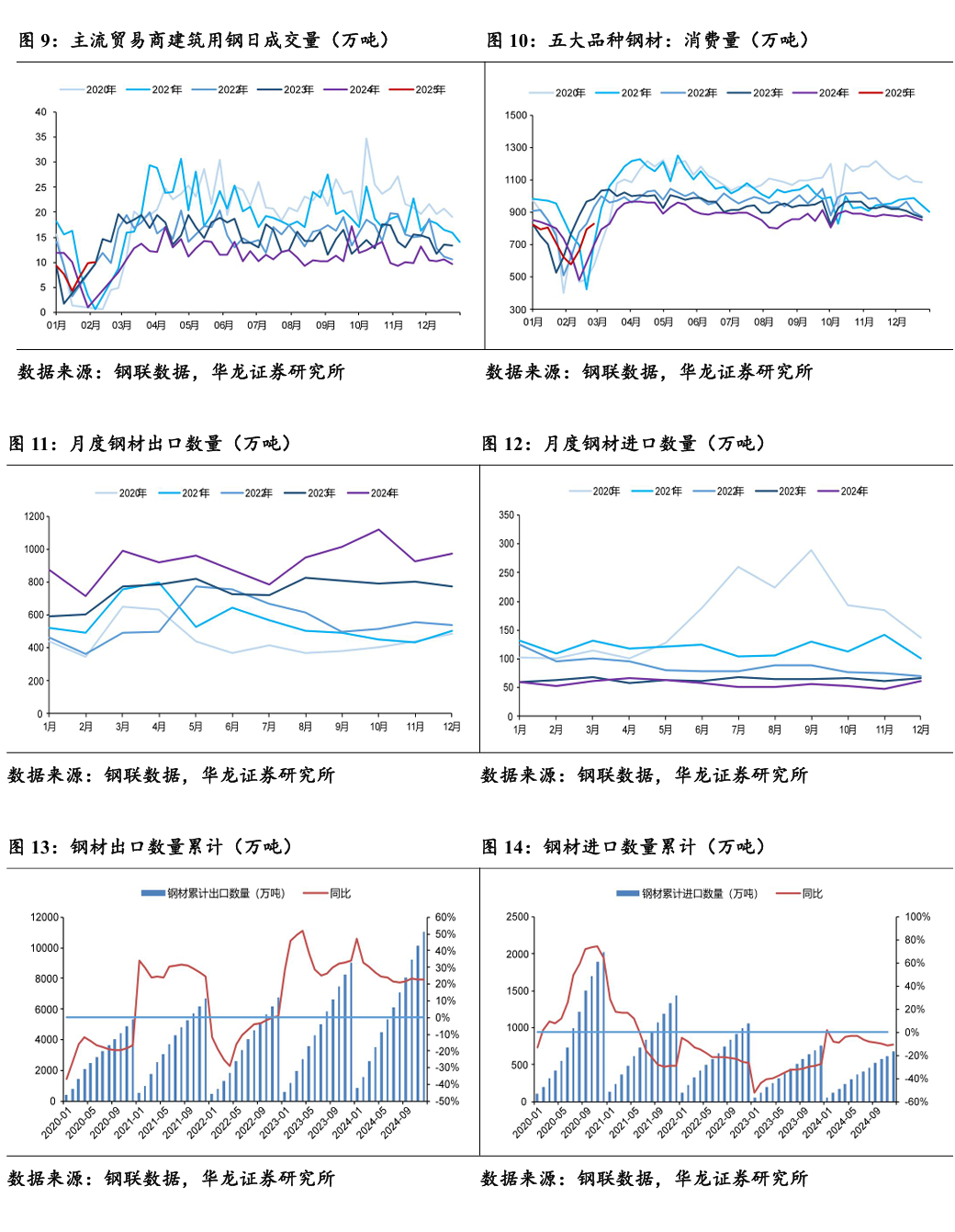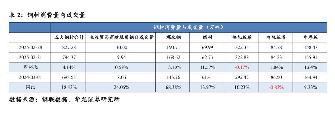截至2025年2月28日,五大钢材合计消费量827.28万吨,周环比上升4.14%,同比上升18.43%;主流贸易商建筑用钢日成交量10.00万吨,周环比上升0.59%,同比上升24.06%;截至2024年12月钢材单月出口数量合计972.70万吨,月环比持平,同比上升11.24%,月度累计出口数量合计11071.60万吨,月环比下降0.31%,同比上升1166.17%。
