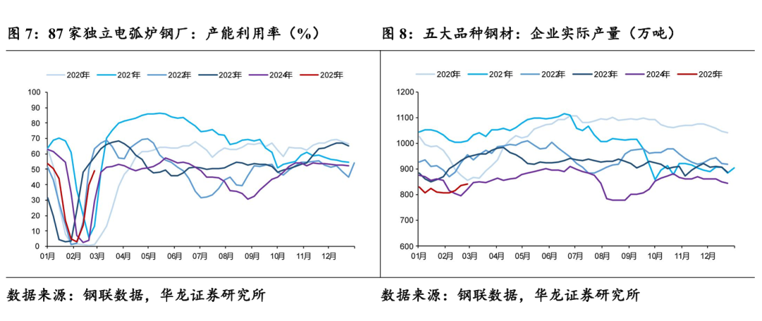 供给端:截至2025年2月28日,五大钢材合计产量842.26万吨,周环比上升0.75%,同比上升2.66%;247家钢铁企业铁水日均产量227.94万吨,周环比上升0.19%,同比上升2.28%;247家钢铁企业高炉产能利用率85.58%,周环比上升0.17 pct,同比上升2.24 pct;87家独立电弧炉钢厂产能利用率48.91%,周环比上升8.81 pct,同比上升19.80 pct。五大钢材中除线材及热轧卷板外,其他钢材供给周环比上涨,铁水日产周环比小幅上涨。