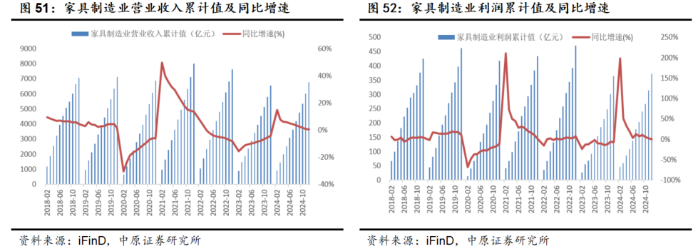家具制造业营业收入微增,利润总额增速转负,行业持续承压。2024年1-12月,我国家具制造业累计实现营业收入6771.5亿元,同比增长0.4%,增速持续放缓;利润总额372.4亿元,同比下降0.1%,增速较上月由正转负,行业盈利持续承压。