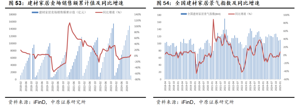 建材家居卖场累计销售额同比增长,全国建材家居景气指数BHI环比提升。根据中国建材流通协会,1月处于全国建材家居市场传统冬日淡季,月底的春节假期也导致商家暂停营业,但2025年1月全国规模以上建材家居卖场销售额仍实现了同比上涨,这主要得益于2025年以旧换新政策的加码,企业参与积极性不断提升;同时,元旦假期和春节前的促消费氛围激发了市场活力,保障了建材家居消费需求的部分提前释放。在以旧换新政策拉动下,全国建材家居市场迎来良好开局,BHI环比微涨,市场展现出积极的发展态势。2025年1月建材家居卖场销售额为1095.27亿元,同比增长3.09%。2025年1月全国建材家居景气指数(BHI)为110.35点,同比+8.46点,环比+1.53点。