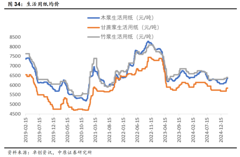 从价格来看,本月生活用纸价格延续上涨,根据卓创资讯,北方地区因春节后部分纸企复工略有延迟,市场供应略紧,加之进口木浆现货价格上涨,成本压力增加,纸企公布涨价函积极促涨情况下,市场价格不断上涨。2025年2月28日,木浆、甘蔗浆、竹浆生活用纸价格分别为6350、5850、6400元/吨,分别较上月末+3.53%、+2.63%、+0.79%。