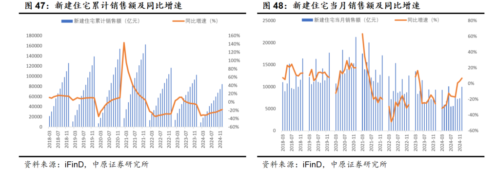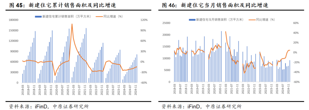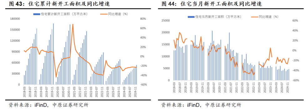 住宅累计、当月新开工面积仍为负增长,但较上月降幅均有收窄,受地产政策影响,销售形势好转,土地成交形势有所扭转,新开工面积有所修复。2024年12月全国住宅新开工面积4671万平方米,同比下降15.82%,降幅较上月明显收窄;1-12月全国住宅累计新开工面积53660万平方米,同比下降23.00%,降幅较上月略收窄。