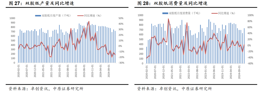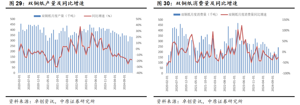 2025年1月,双铜纸月度产量为33.34万吨,同比下降18.22%;2024年12月,月度消费量为24.30万吨,同比下降24.96%。