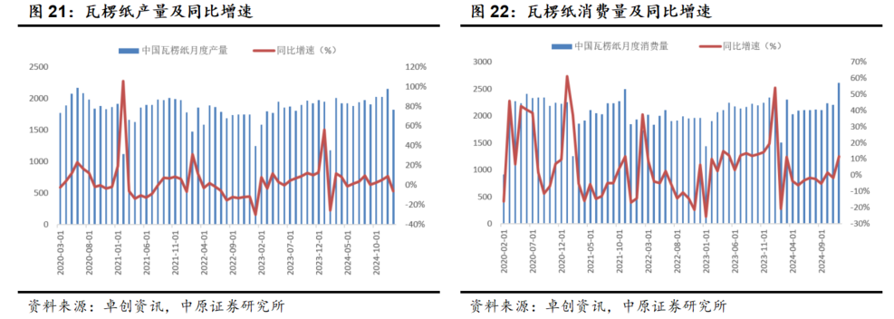 2025年1月,瓦楞纸月度产量为182.28万吨,同比下降6.23%;2024年12月,瓦楞纸月度消费量为261.49万吨,同比增长11.51%。