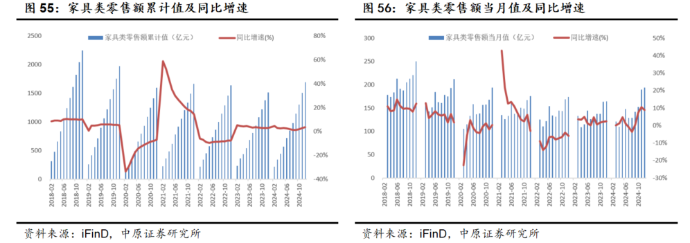 家具类零售额当月及累计增速稳步提升,消费品以旧换新政策加力带动下,消费需求进一步释放,家具类零售额呈现稳步回升。2024年12月家具类消费品零售额193.6亿元,同比增长8.8%,保持正增长;1-12月家具类消费品零售总额1691.1亿元,同比增长3.6%,增速较上月提高了0.7个百分点。