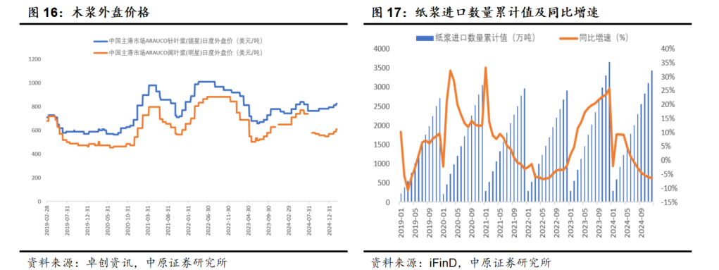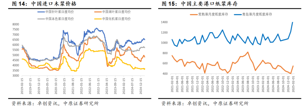 造纸:受到库存上升和出口预期下降影响导致废黄板纸价格下跌,中国进口针叶浆、阔叶浆价格2月份经历先涨后跌,外盘报价上涨,继续偏强运行;包装纸价格先涨后跌,成本面缺乏支撑,库存压力增加;文化纸受益于成本端浆价偏强运行,部分纸厂公布涨价,涨价预期下业内信心提振,双胶纸价格小幅上移,双铜纸价格偏强运行;近期海外大厂继续上调针叶浆及阔叶浆报价,智利Arauco对2025年3月针叶浆银星报价825美元/吨,较上月上涨10美元/吨,阔叶浆明星报价610美元/吨,较上月上涨20美元/吨,预计浆价未来仍将上行,进而带动文化纸、白卡纸、生活用纸等浆纸系纸品价格提升。