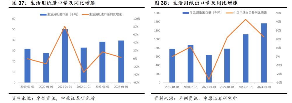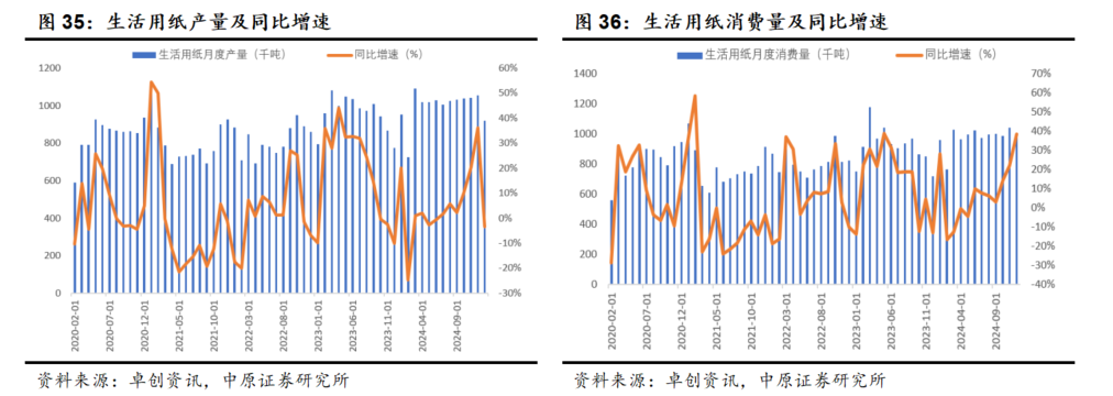 从产消情况来看,产量同环比有所下降,根据卓创资讯,因1月下旬处于春节假期前夕,加之原料价格持续拉涨,成本增加,部分纸企开工积极性下降,陆续进入停机状态,导致生活用纸产量下降。2025年1月,生活用纸月度产量为92.05万吨,同比下降3.46%;2024年12月,月度消费量99.54万吨,同比增长38.52%。