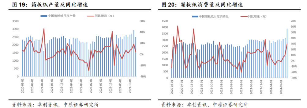 从产消情况来看,箱板纸产量同比增长而瓦楞纸产量同比下降,根据卓创资讯,主要由于1月份纸厂停机检修情况增多,周期内陕西、四川、江苏等地区开工负荷率下滑明显。2025年1月,箱板纸月度产量为249.83万吨,同比增长3.86%;2024年12月,箱板纸月度消费量为388.95万吨,同比增长30%。