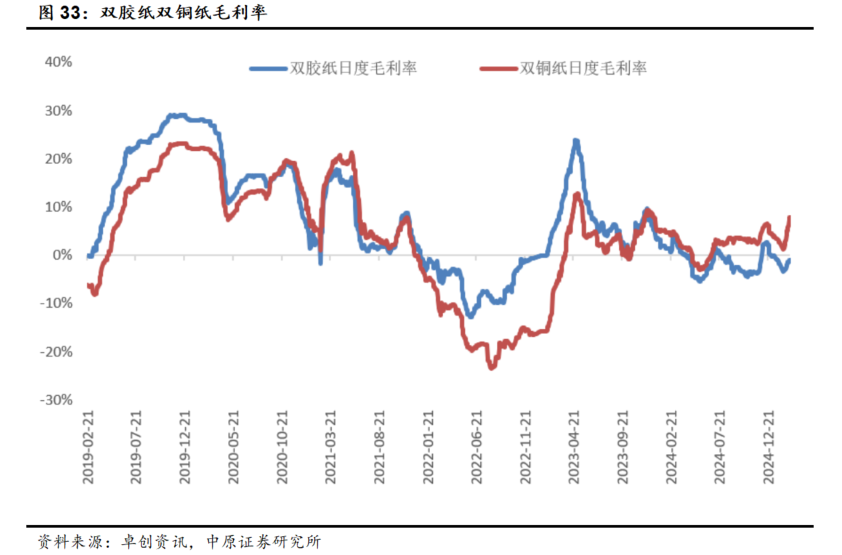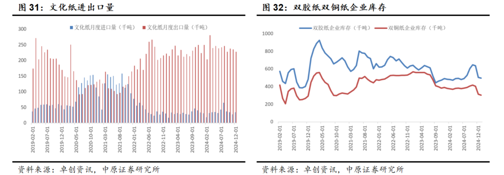从库存来看,库存环比继续下降,为连续第三个月下降,根据卓创资讯,双胶纸方面,出版类订单提货陆续扫尾,同时随着临近节日,下游印刷厂亦在中下旬陆续放缓采买节奏,因此整体持续去库;双铜纸方面,部分刚需类订单提货相继扫尾,且中下旬期间随着临近节日,经销商及下游用户备库均趋谨慎。2025年1月,双胶纸、双铜纸企业库存分别为49.53、30.30万吨,同比分别+2.37%、-20.05%,环比分别-2.01%、-3.81%。