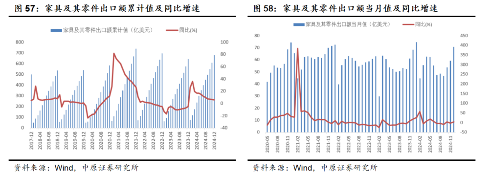 家具出口累计金额增速继续收敛,当月出口增速由负转正有所回升。2024年12月家具及零件出口金额70.62亿美元,同比增长3.2%,增速由负转正,家具出口增速回升;1-12月家具及零件出口金额累计678.84亿美元,同比增长5.8%,增速继续收敛。