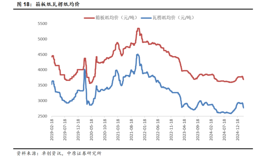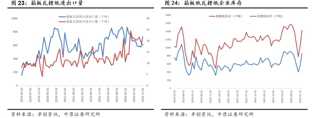 从库存来看,库存环比由降转增,根据卓创资讯,2月份各大区瓦楞及箱板纸企业平均库存天数呈现增加趋势,由于当月市场价格下滑为主,节后下游接单一般,在降价氛围下,包装厂拿货积极性不高,多以刚需为主,纸厂出货缓慢,且随着市场开工情况的逐步恢复,整体纸厂库存呈现增加趋势。2025年2月,箱板纸和瓦楞纸月度企业库存分别为142.9万吨、85.7万吨,分别同比+19%、+39%,分别环比+37%、+52%。