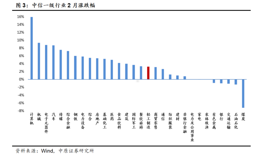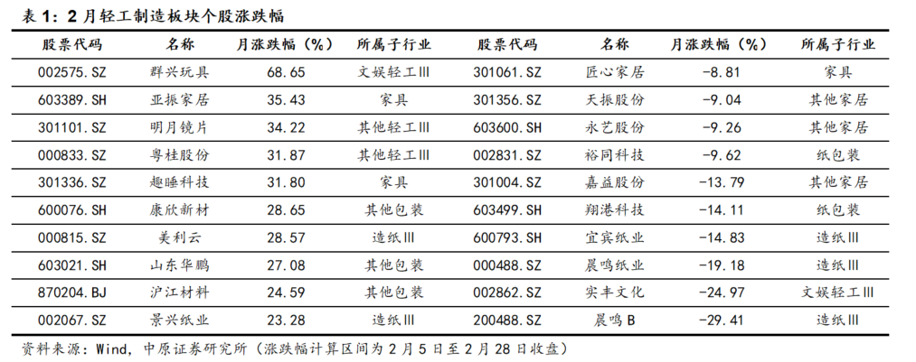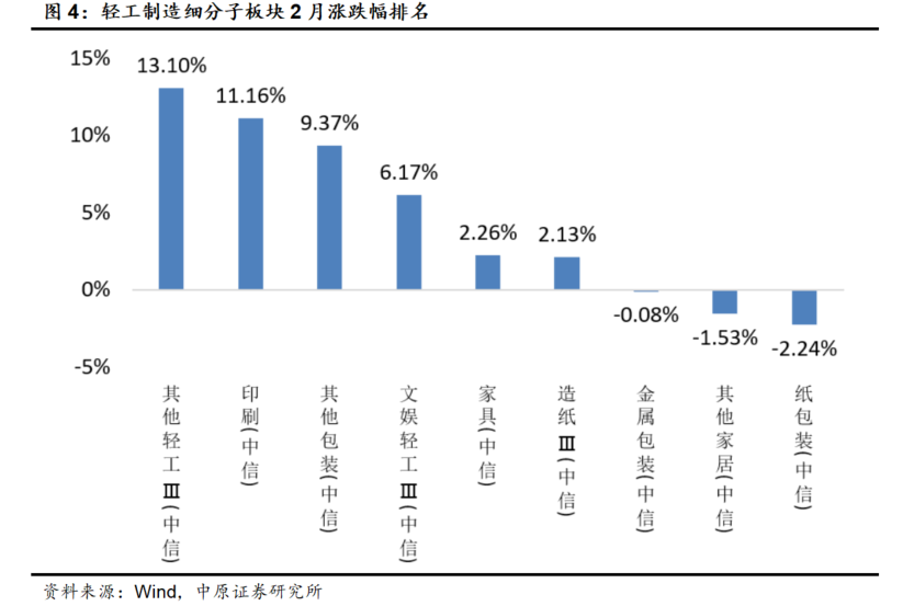 2025年2月,轻工制造各细分子板块多数上涨,具体涨跌幅排名如下:其他轻工(13.10%)、印刷(11.16%)、其他包装(9.37%)、文娱轻工(6.17%)、家具(2.26%)、造纸(2.13%)、金属包装(-0.08%)、其他家居(-1.53%)、纸包装(-2.24%)。