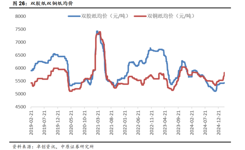 从价格来看,双胶纸2月价格小幅上移,双铜纸价格偏强运行。根据卓创资讯,双铜纸强势运行有几方面原因:第一,月内部分纸厂公布涨价函,意向于下月继续提涨200元/吨,提振业者信心;第二,个别规模产线仍未复产,局部供应趋紧,略存支撑;第三,经销商盼涨心理升温,为规避后市自身经营风险,月内出货价格趋于上调;第四,上游浆价虽略震荡,但针叶浆及阔叶浆均价有所上涨,成本端存有支撑。2025年2月28日,双胶纸、双铜纸价格分别为5425、5820元/吨,分别较上月末上涨0.23%、5.24%。